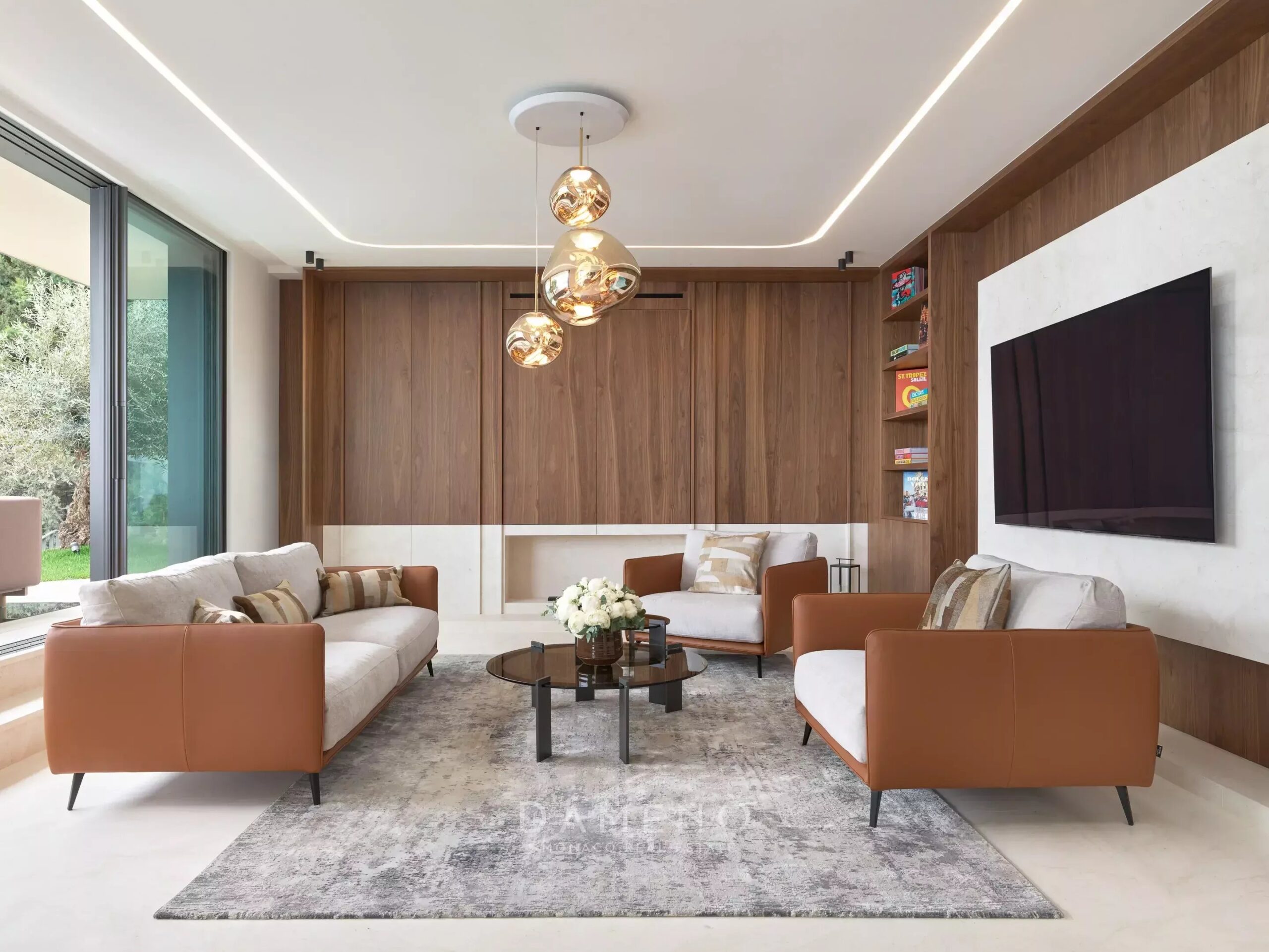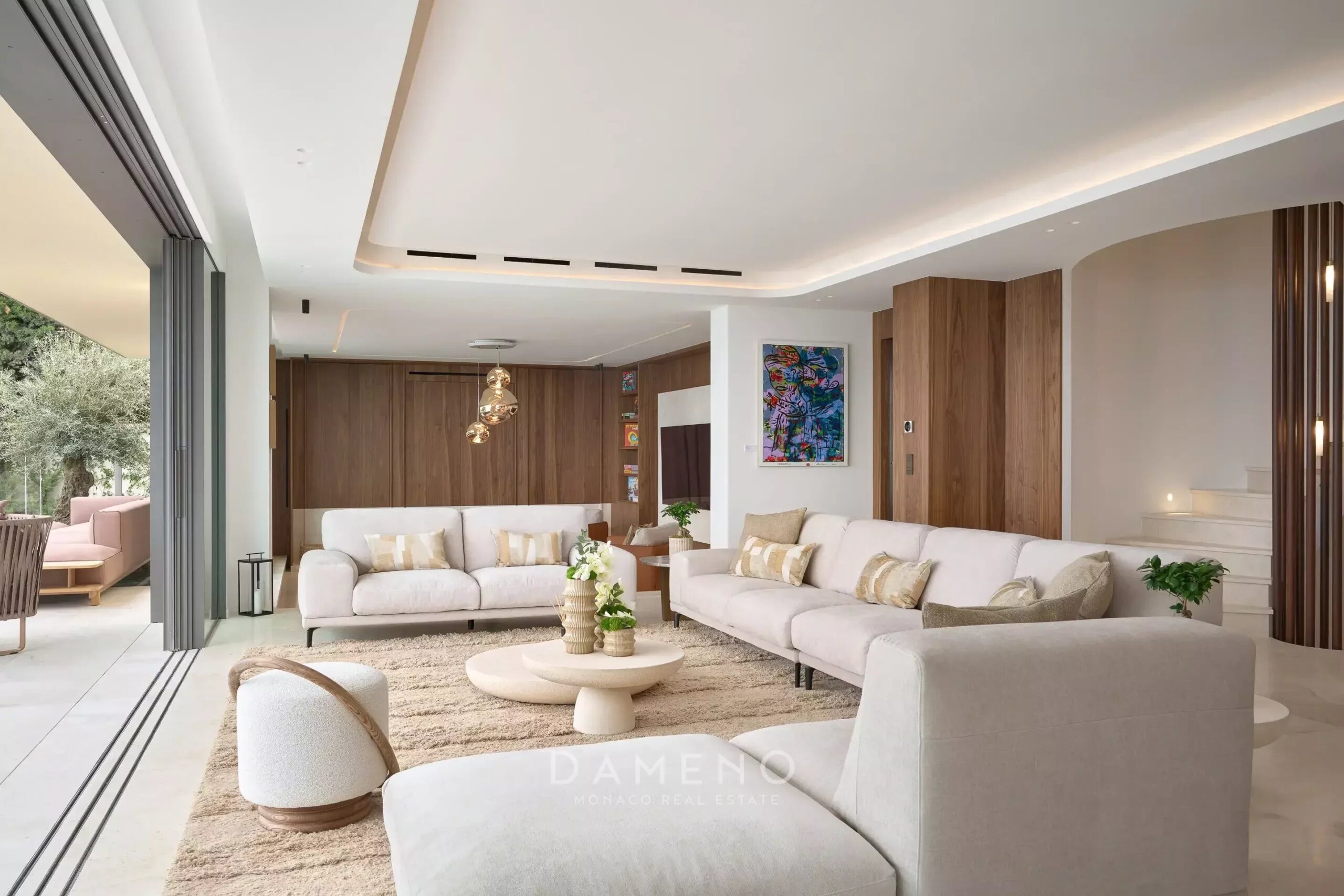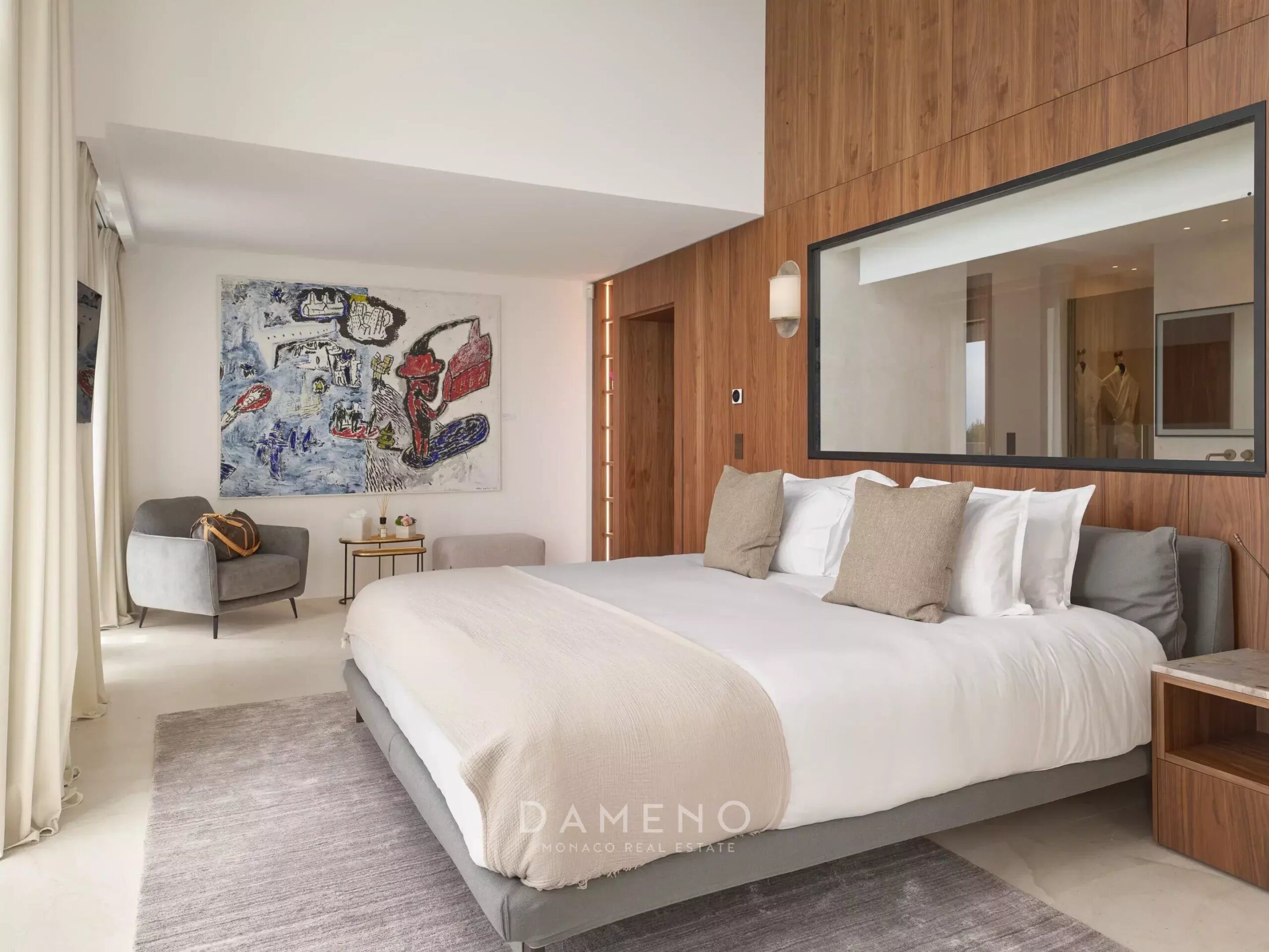Die Villa verfügt über fünf Schlafzimmer, sieben Badezimmer, einen Aufzug, einen Parkplatz für drei Autos, mehrere Terrassen, zwei Wohnbereiche, eine zum Esszimmer hin offene Küche, eine Bar, einen Sitzbereich im Freien, einen Außenpool mit Entspannungsbereich, ein Spa mit Innenpool, einen Massageraum, eine Sauna und einen Fitnessraum.