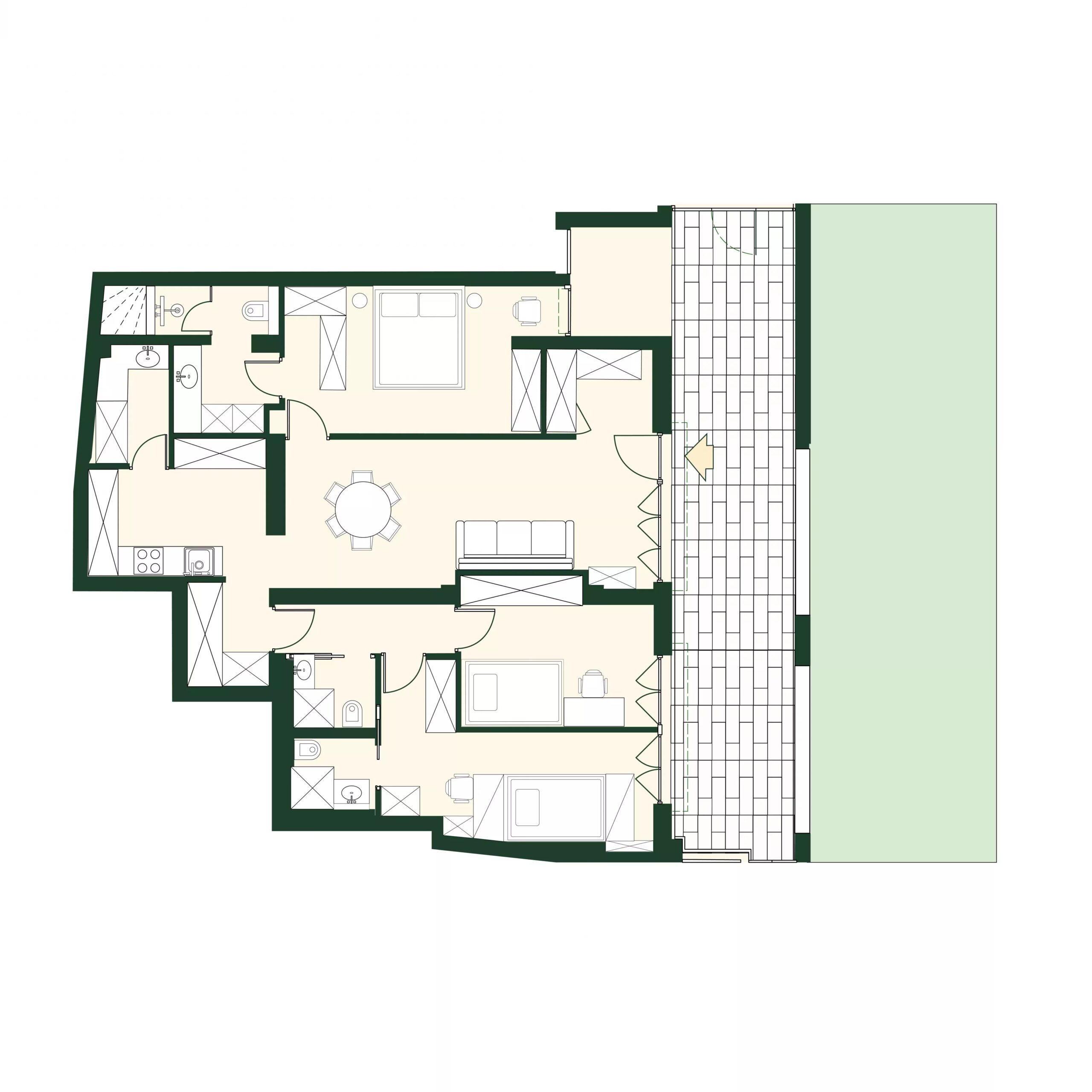 Une généreuse terrasse de 82 m² prolonge l’espace de vie, offrant un cadre extérieur convivial, parfait pour se détendre ou recevoir, avec un accès direct aux jardins paysagers de la copropriété.