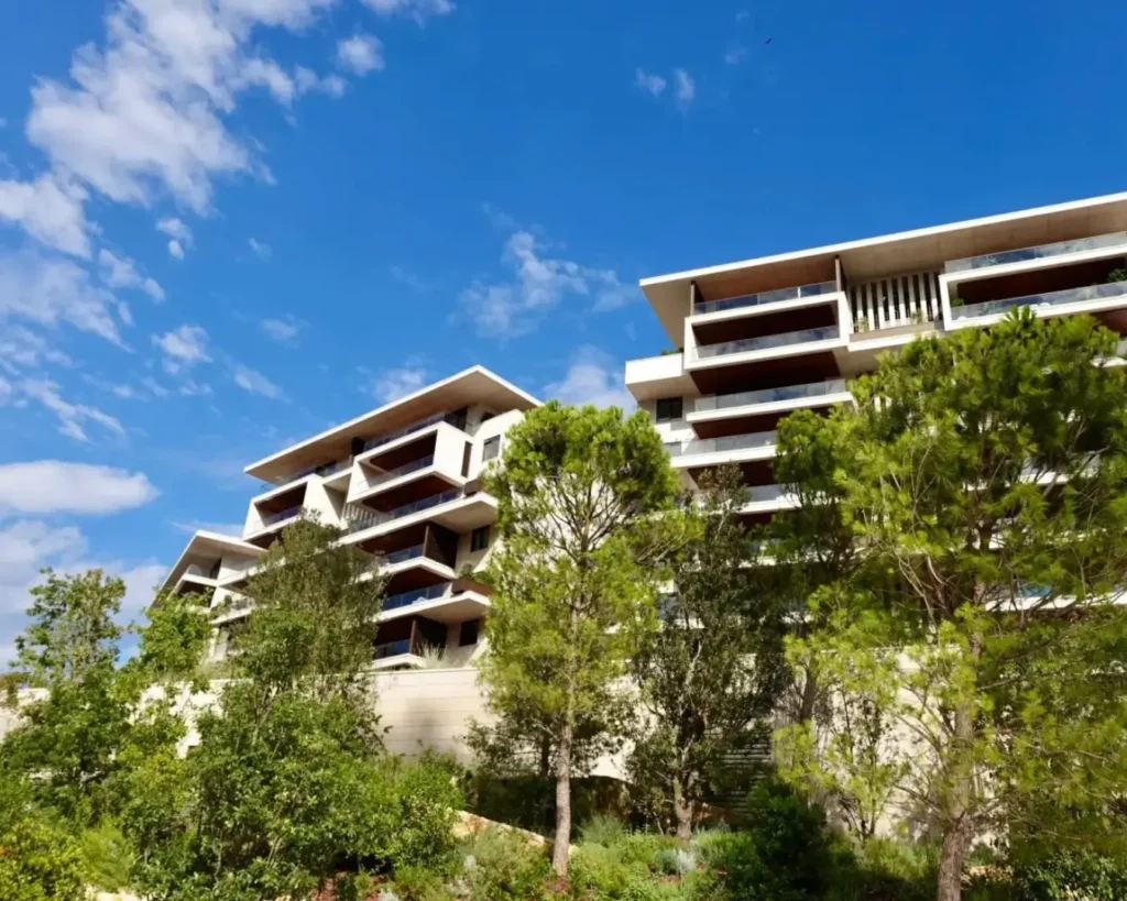 Les Jardins d’Eau is designed around greenery and lower-rise buildings, creating a more residential and tranquil atmosphere. It appeals to buyers who value gardens, privacy, and a sense of space, while still benefiting from Mareterra’s waterfront location.