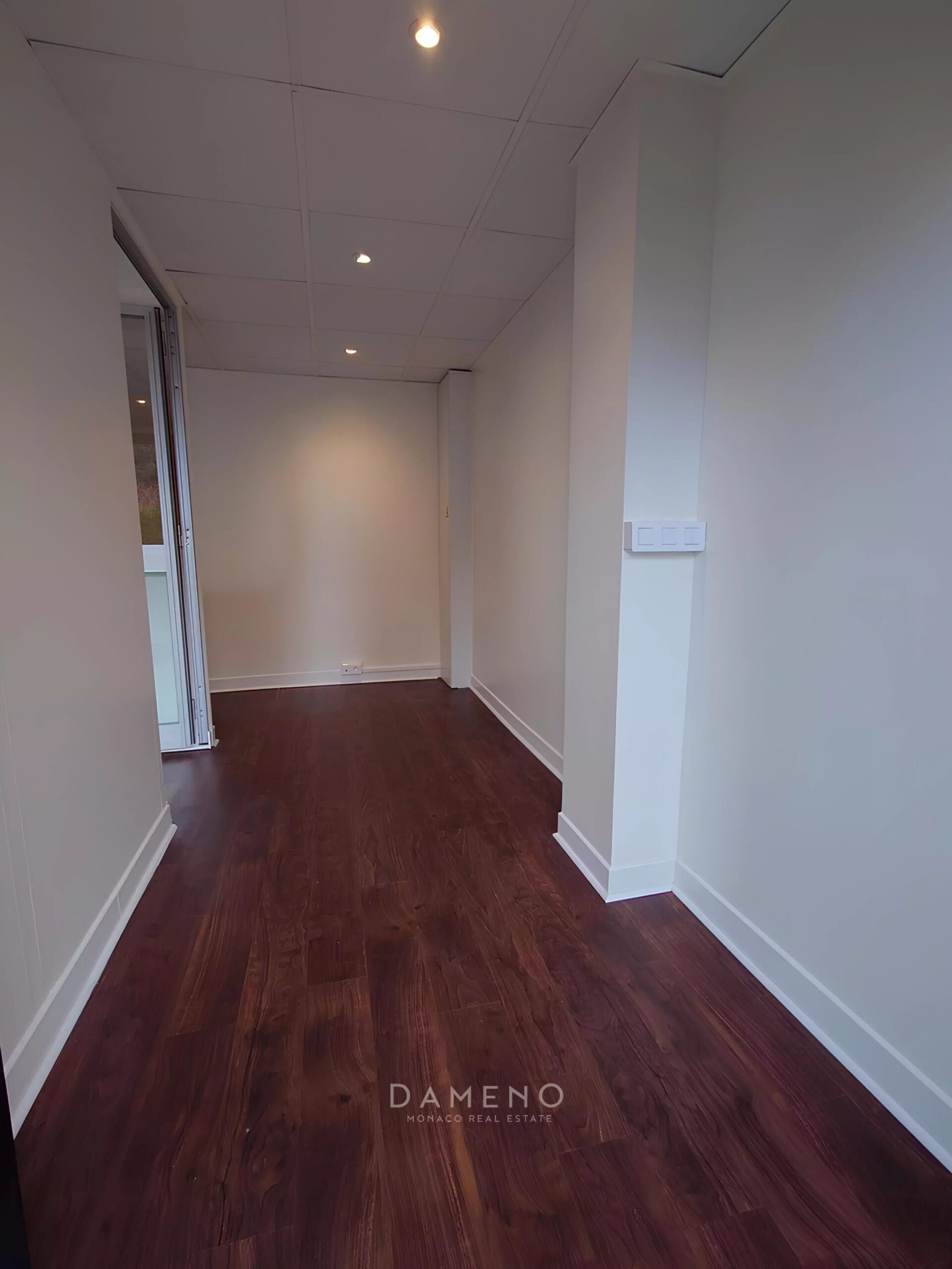 Pleasant renovated 62m² office in a quiet area overlooking the gardens, with parquet flooring and a large display window. It consists of a main room currently partitioned (glass partitions), a toilet, a hallway, and the possibility of a kitchenette.