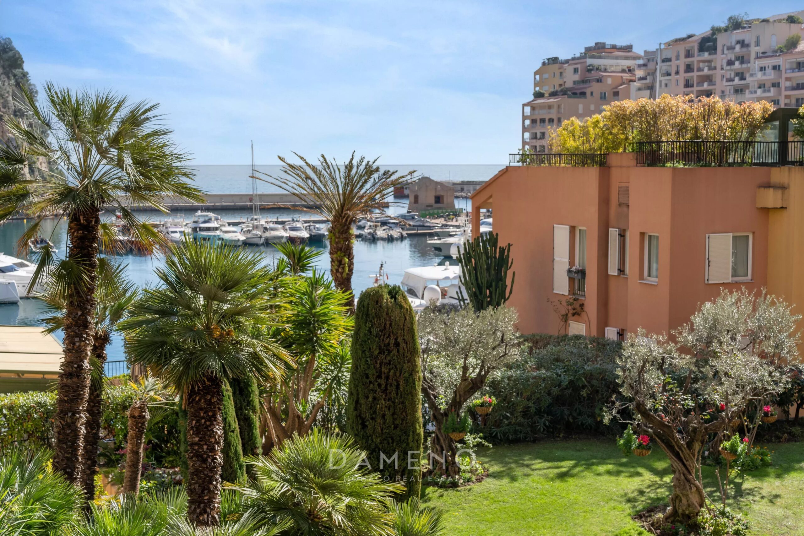 Located opposite the Fontvieille harbour, "Le Giotto" is a building characterized by its position in a quiet and green setting, both set back from the front line of the Port and just above the guard post, facilitating access to Quai Jean Charles Rey as well as Avenue des Papalins. It is one of the very first buildings of the platform built in the late 1960s in a modern construction style.