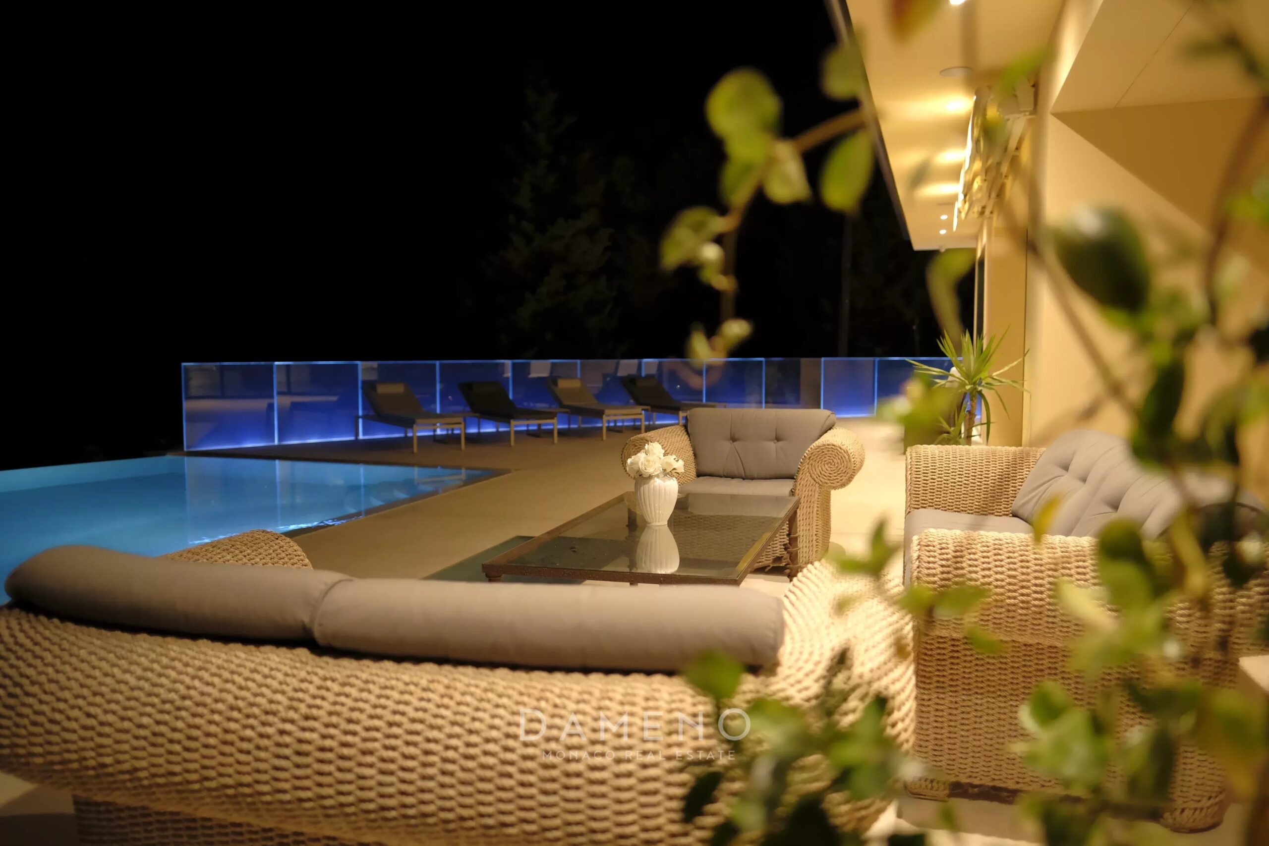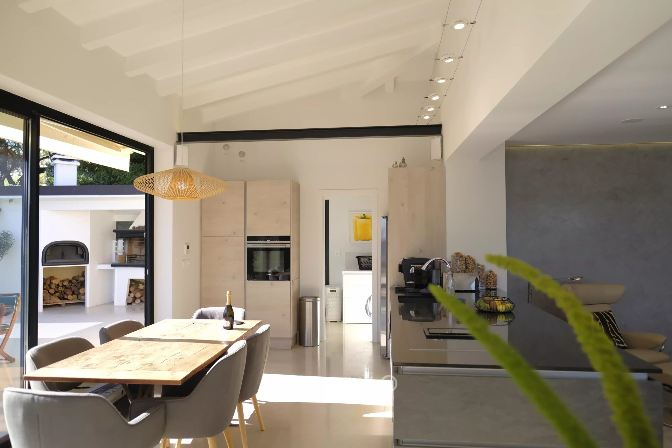 Outdoor enthusiasts will delight in the beautifully designed terrace, complete with a barbecue area perfect for al fresco dining. Enjoy direct access to the swimming pool, ideal for leisure and relaxation. An intercom and videophone enhance security and convenience, while the sleek, modern kitchen comes fully equipped with a coffeemaker, freezer, and oven, catering to your culinary needs with style.