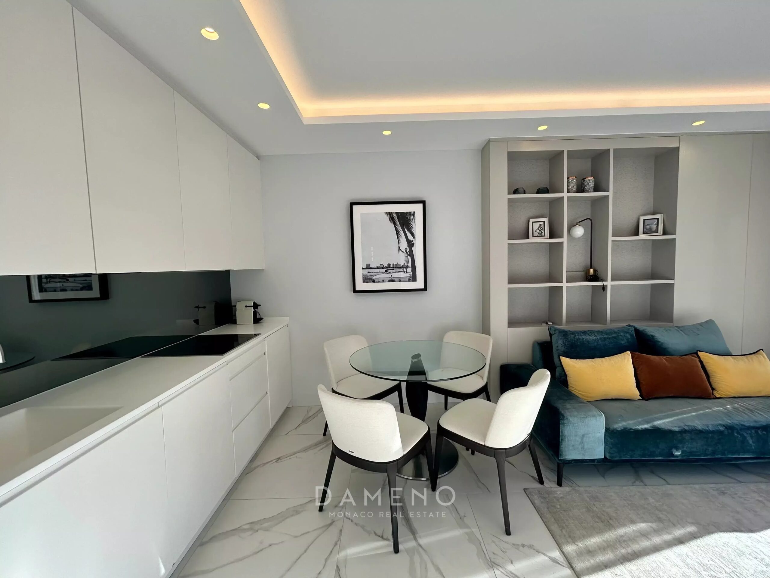 Luxurious, fully renovated one-bedroom apartment located in the luxury residence "Le Millefiori" with concierge service, just steps from the prestigious Carré d'Or.