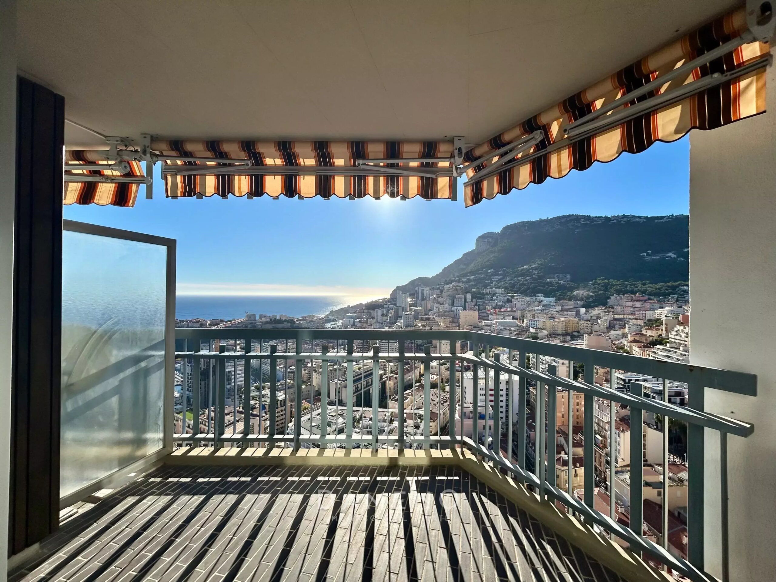 It comprises a living area with an open-plan kitchen opening onto a large terrace with sea and Monaco views, a bedroom with an en-suite shower room with access to the terrace, and a separate toilet.