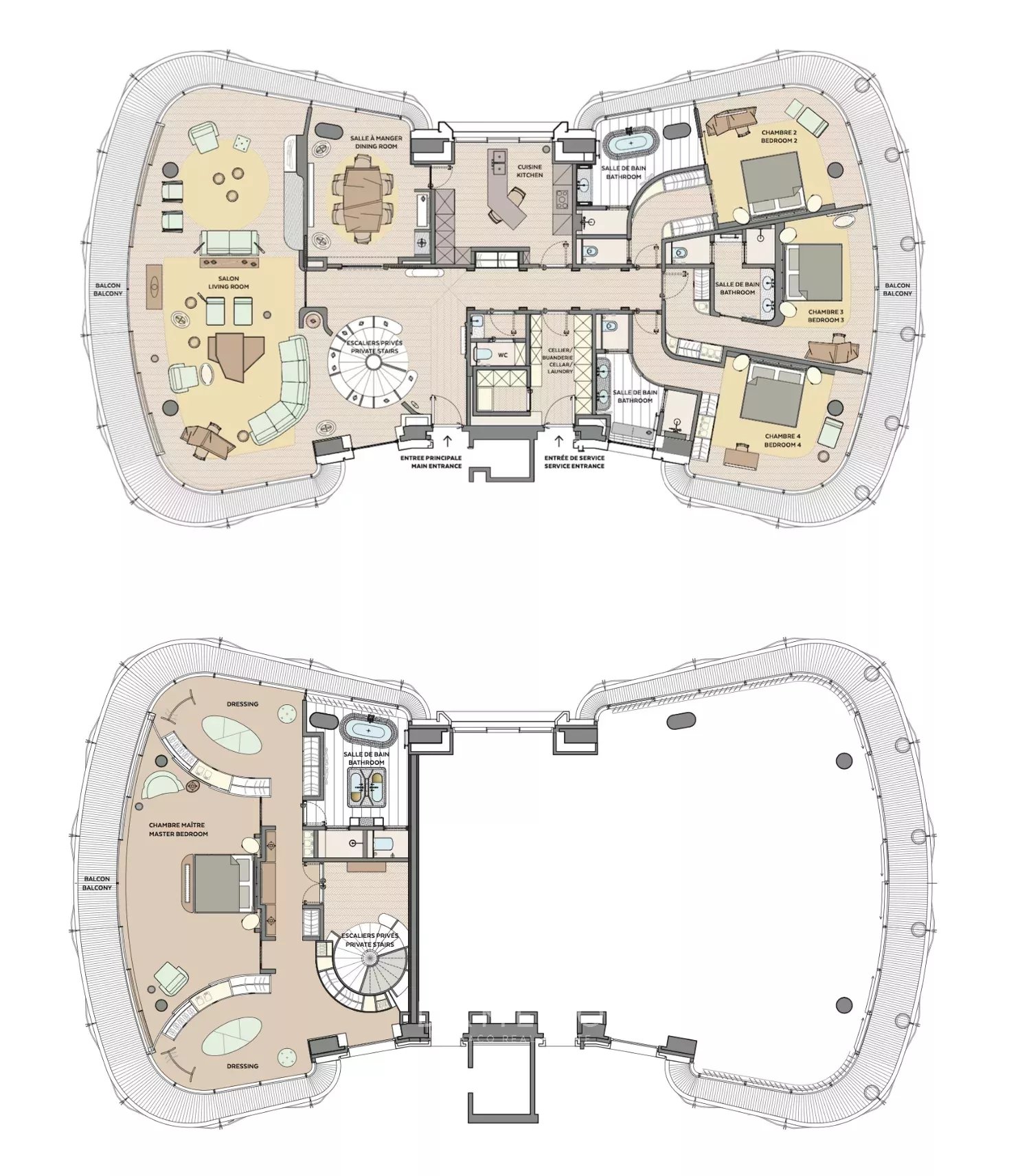 With a total surface area of 410 sqm, this fully furnished and tastefully decorated duplex is arranged over two levels. The main floor features an entrance hall leading to a spacious living room with panoramic views, a dining room, a fully equipped kitchen, three bedrooms with en-suite bathrooms and dressing rooms facing Italy, a separate staff entrance with a laundry room, and guest toilets. The lower level is entirely dedicated to a sumptuous master suite with its own bathroom and two generous walk-in wardrobes, offering absolute comfort and privacy.