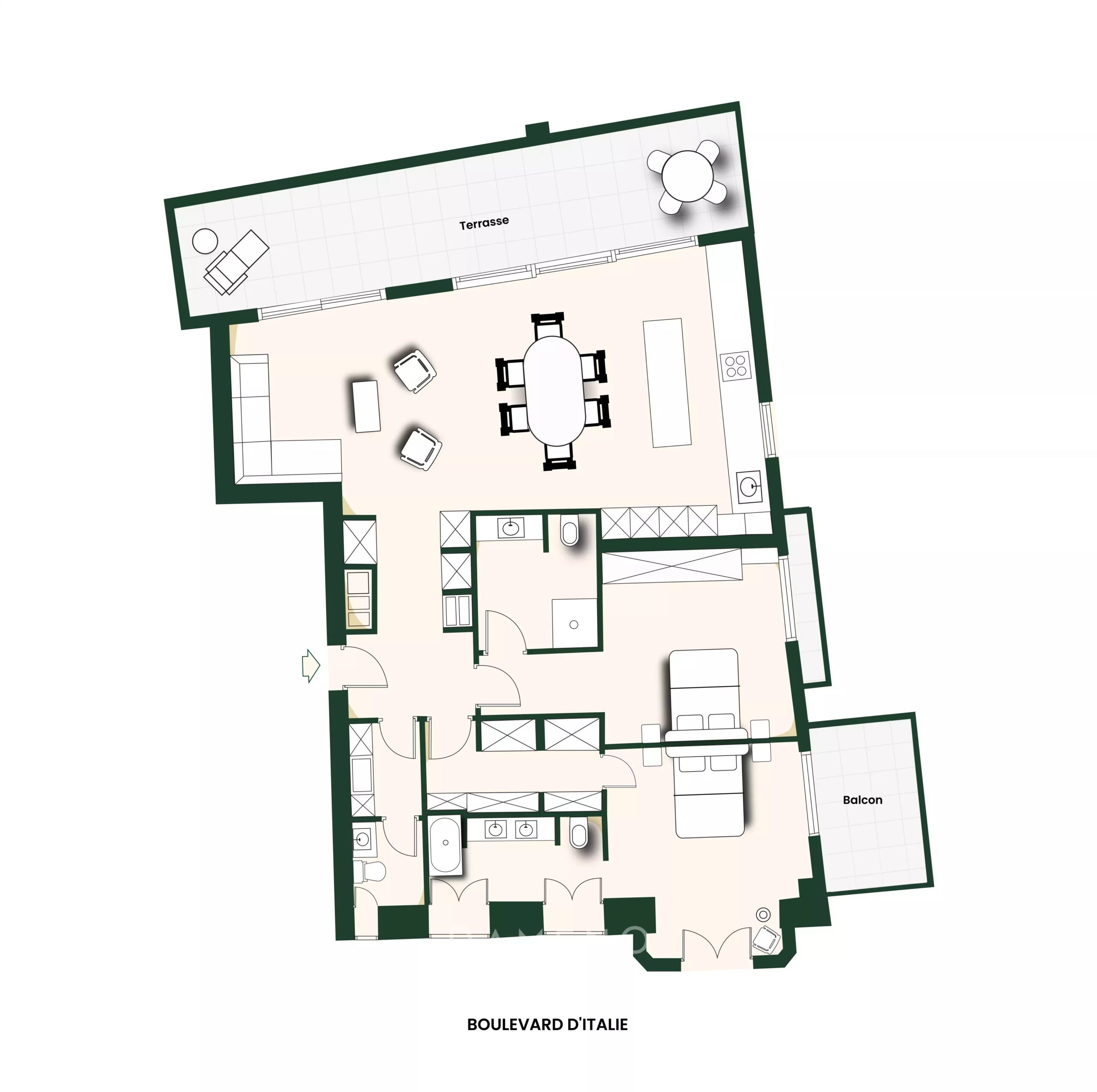 This apartment boasts a privileged location, close to shops, Michelin-starred restaurants, and the iconic landmarks of the Principality.
