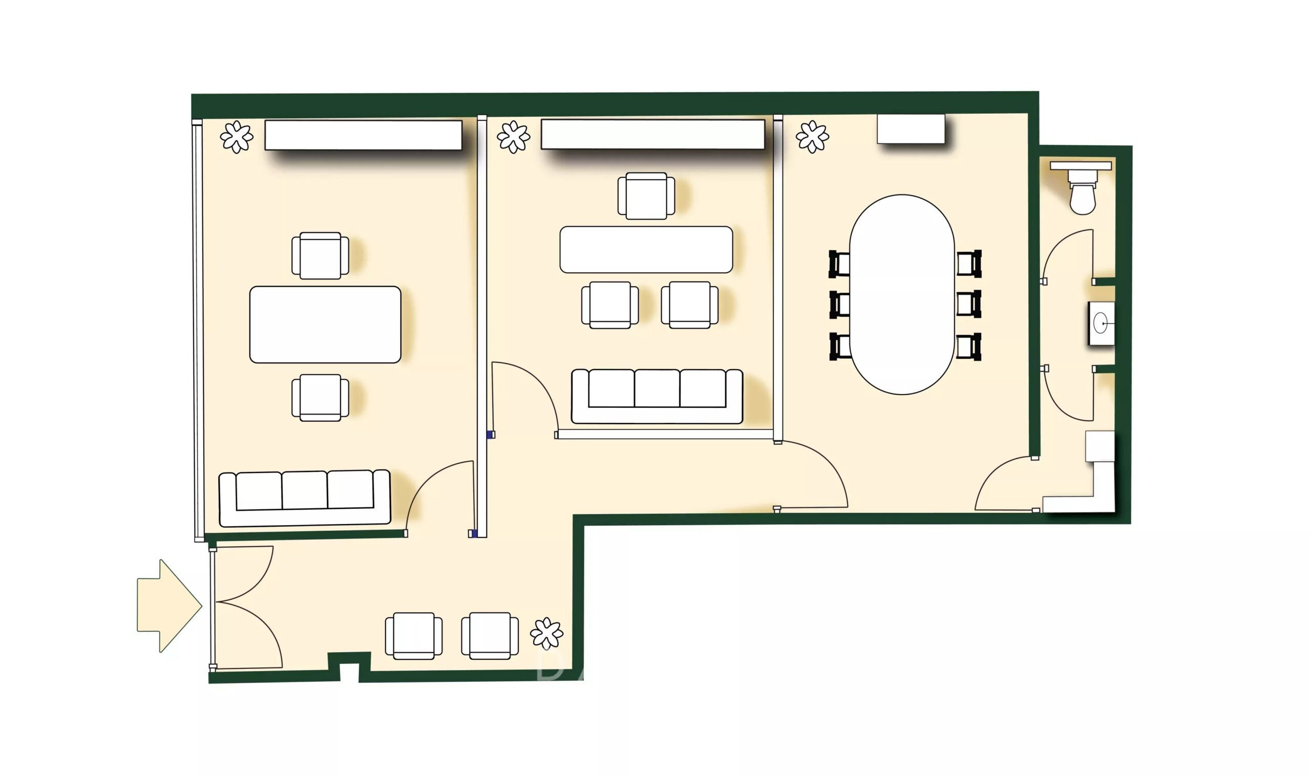 Pleasant renovated 62m² office in a quiet area overlooking the gardens, with parquet flooring and a large display window. It consists of a main room currently partitioned (glass partitions), a toilet, a hallway, and the possibility of a kitchenette.