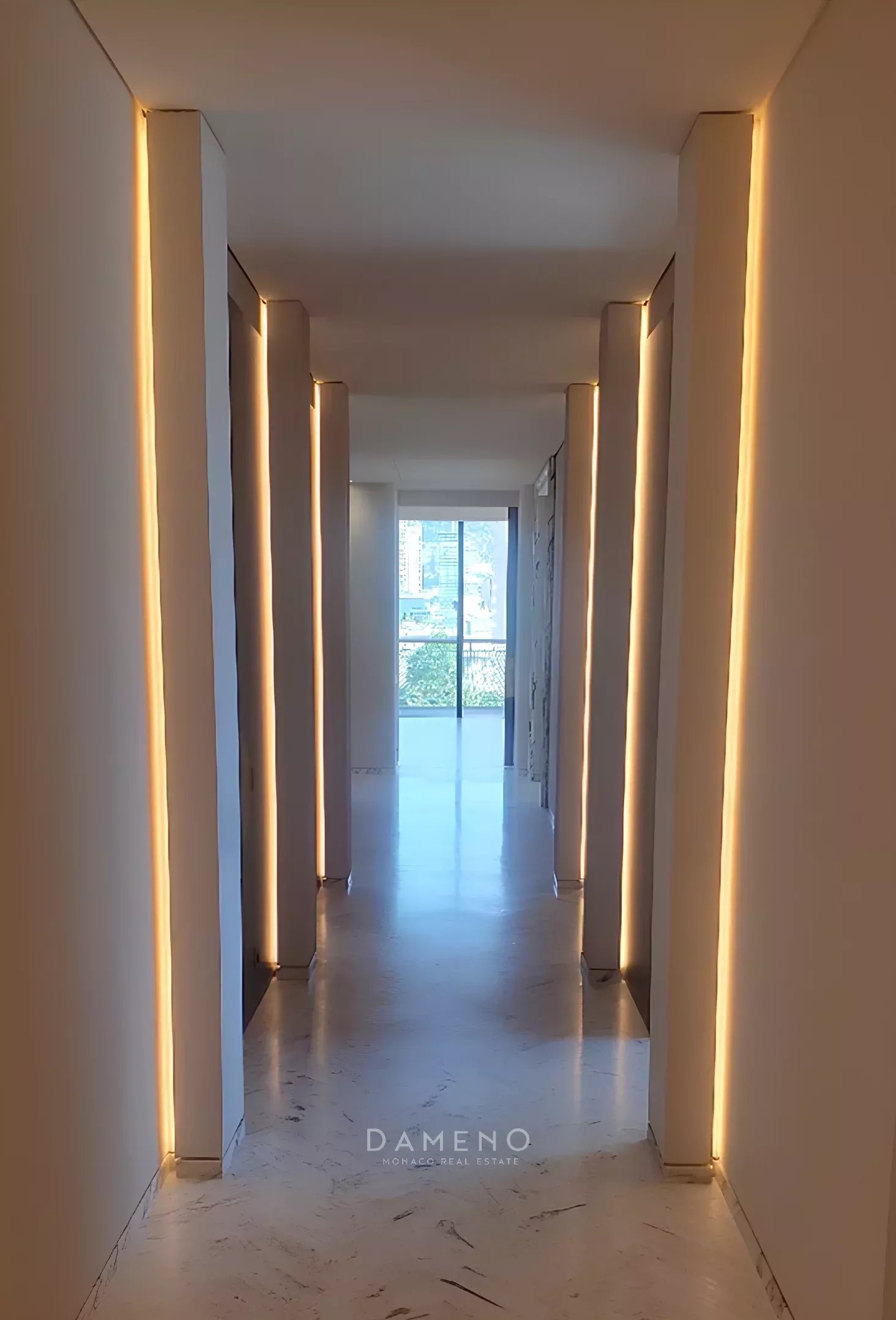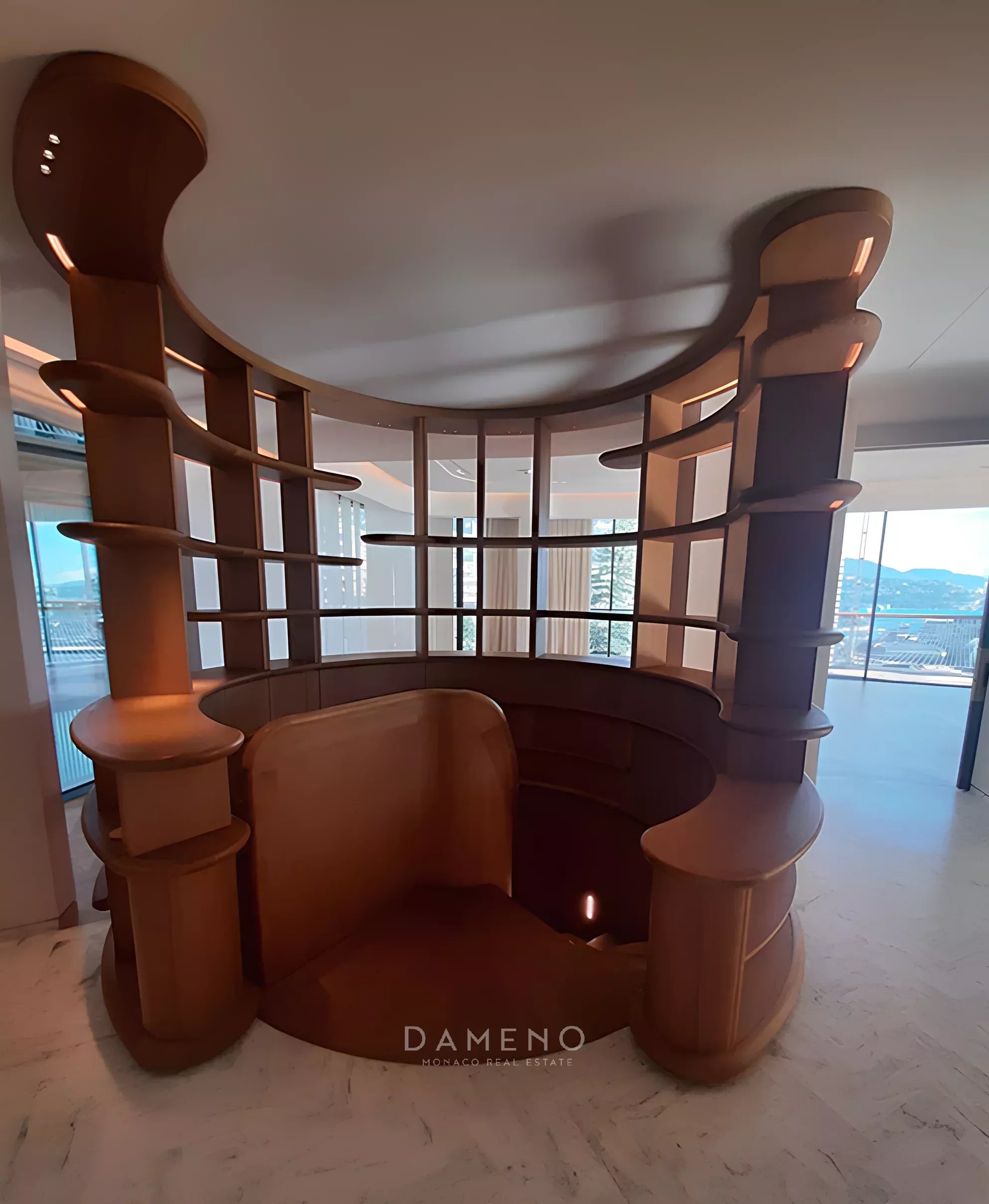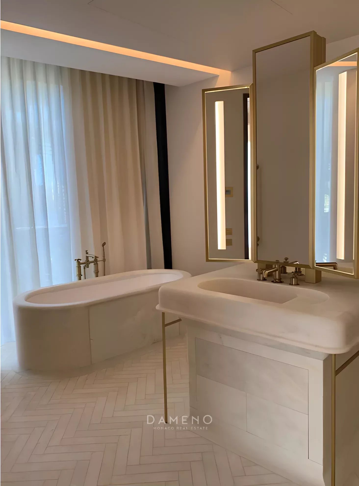 This sumptuous duplex offers 410 sqm of living space, extended by wide balconies with breathtaking views over the Casino Square, the sea, and the Hôtel Hermitage. The main level includes a spacious and bright living room, a dining area, a fully equipped kitchen, three bedrooms with en-suite bathrooms and dressing rooms, a separate staff entrance with a fully equipped laundry room, and guest toilets. The lower level is entirely dedicated to the master suite, featuring a bathroom and two walk-in closets.